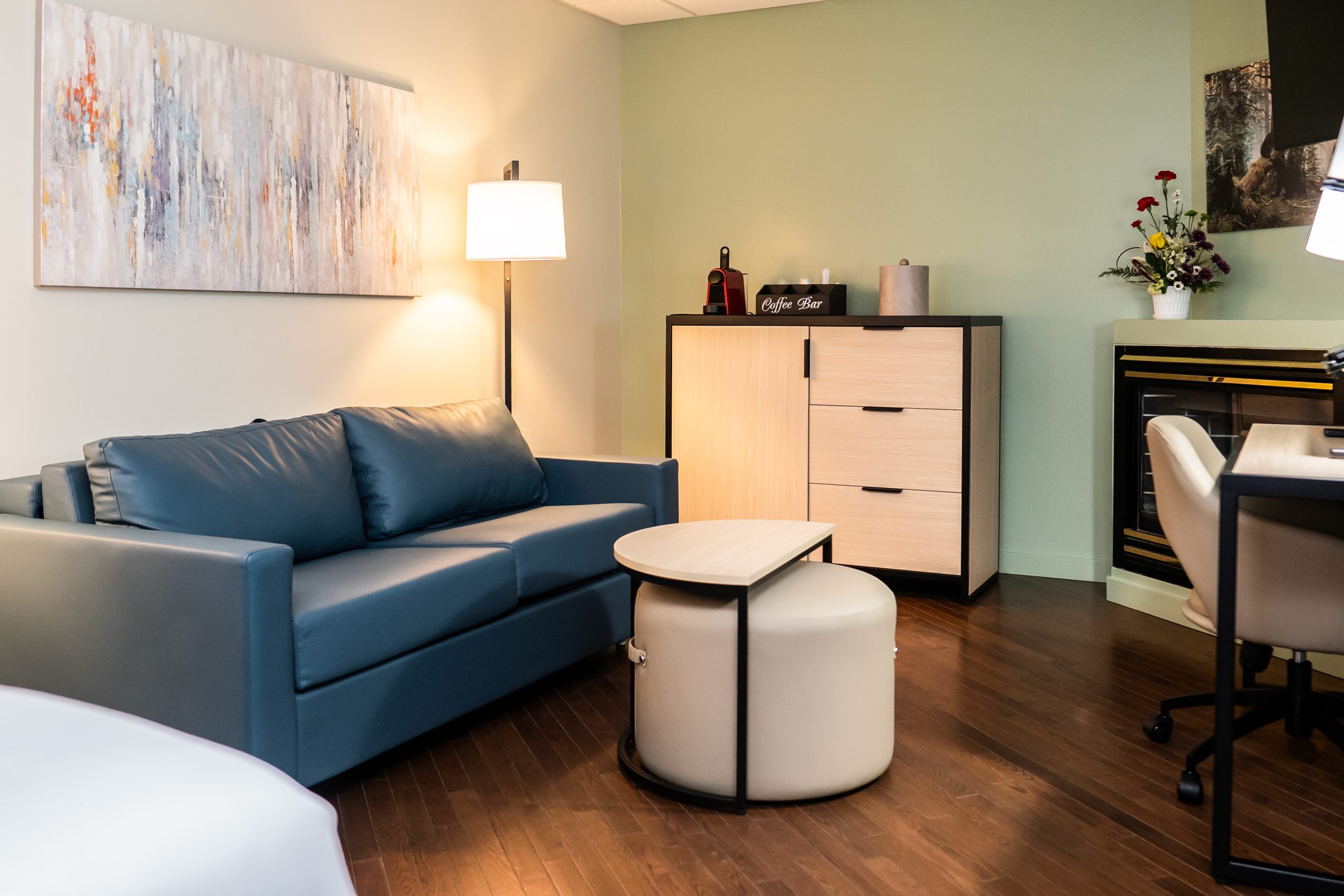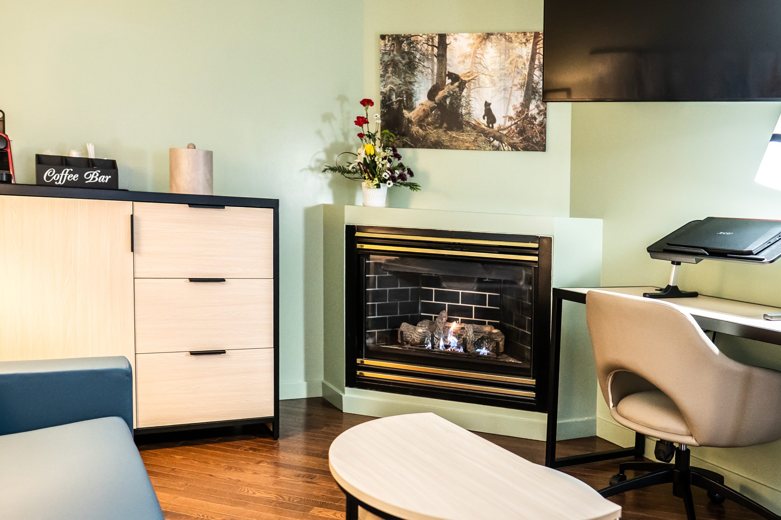 Discover the pinnacle of comfort and sophistication in our Executive Suite, designed for discerning travelers. Indulge in modern elegance where a crackling fireplace and a spacious sitting area with a convenient sofa bed await – perfect for accommodating extra guests. Entertainment is at your fingertips with a 50″ Hi-Def television. Step directly onto your private terrace and embrace the tranquility.